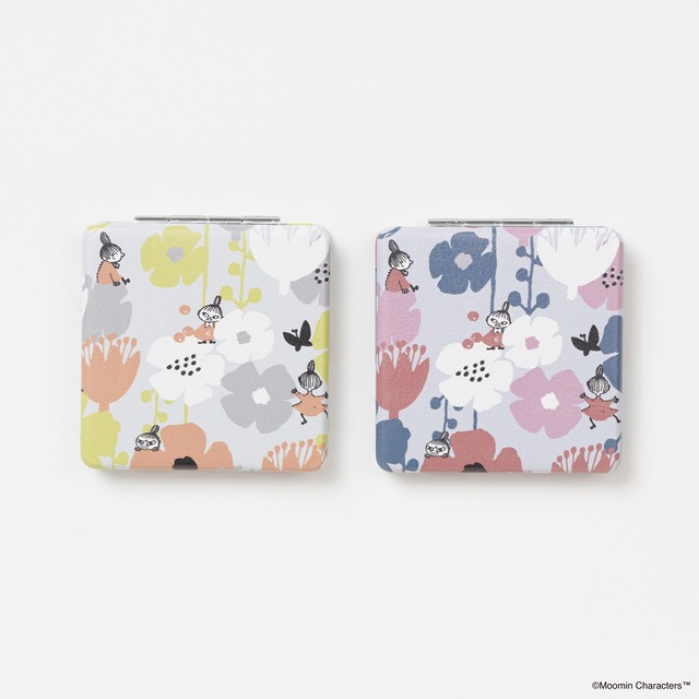 リトルミイとお花が華やかに描かれたコンパクトミラーです。片面は普通サイズ、片面は拡大鏡です。全2色 SIZE:W60×H60XD10mm 素材:合成革皮 ガラスミラー