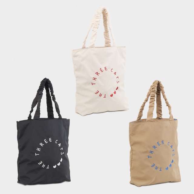 リサイクルナイロン生地にスリーキャッツのロゴを大胆に刺繍しました。ショルダーのシャーリング加工が肩にかけた時にフリルのように見える可愛いトートバッグです。内ポケットには、スリーキャッツのネコ達が隠れています。 SIZE:W370(底275)×H360×D105mm(持ち手:W38×H480mm) 素材:表生地:ナイロン、内生地:ポリエステル