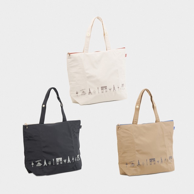 リサイクルナイロン生地に保冷生地を合わせました。バッグ型に小さく折りたたんでコンパクトになる保冷バッグ。パリの街にお出かけしたネコ達と一緒にお出かけを楽しんでください。 SIZE:W440(底345)×H345×D145mm(持ち手:W35×H540mm) 素材:表生地:ナイロン、内生地:ポリエステル