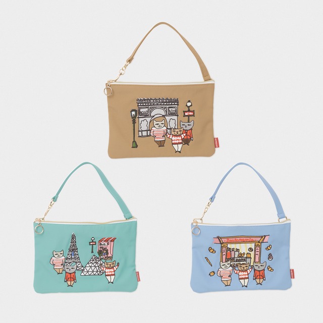 リサイクルナイロン生地にスリーキャッツのネコ達をカラフルに刺繍しました。絵本の一場面のように楽しい絵柄のポーチです。 SIZE:W230×H160mm(持ち手:W15×H345mm) 素材:表生地:ナイロン、内生地:ポリエステル、金具:亜鉛合金