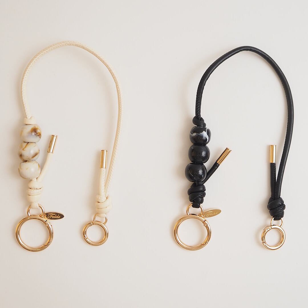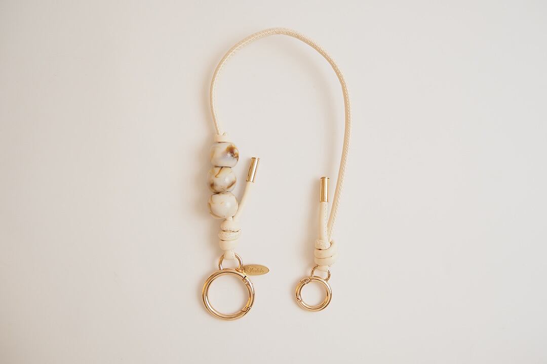 丸紐とアクセントに大きめのマーブルビーズを使ったデザインのハンドタイプのショートストラップです。スマートフォンだけでなくバッグのハンドストラップ等としても活用できます。 全2柄 素材:合成皮革、アクリル、亜鉛合金