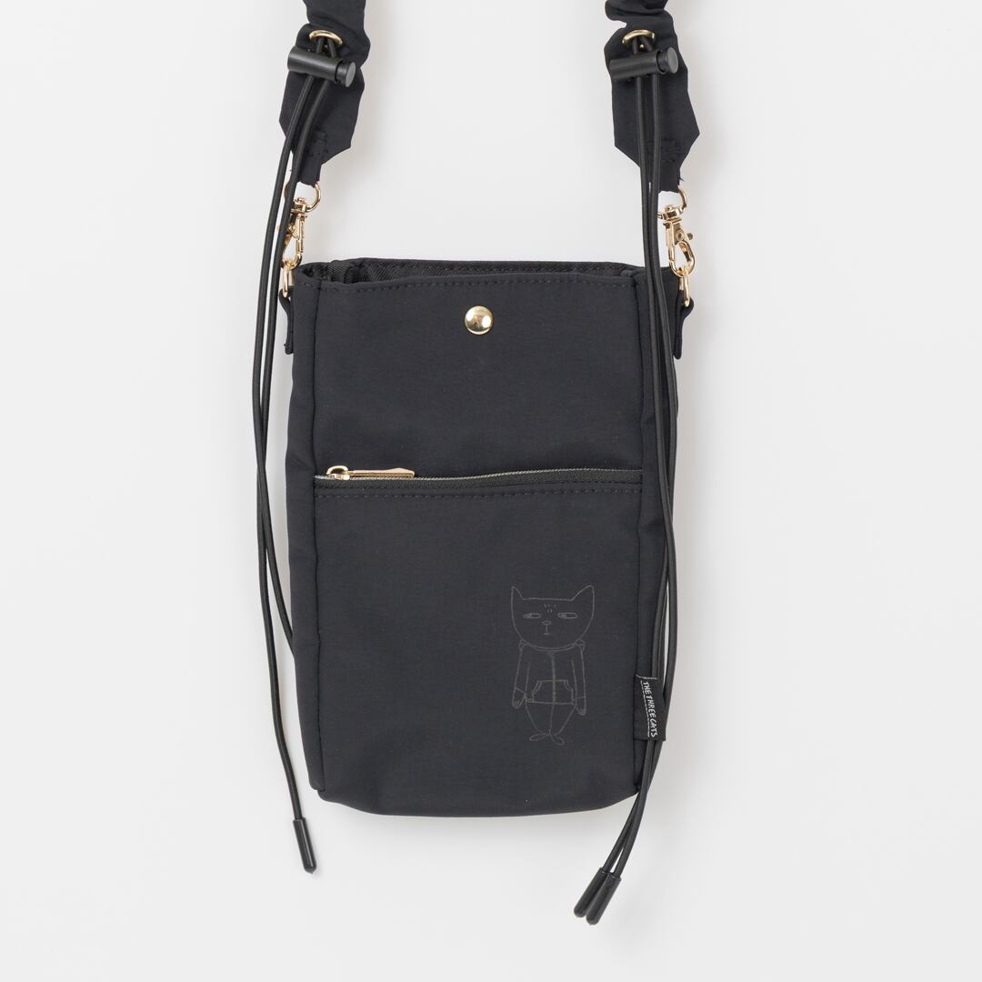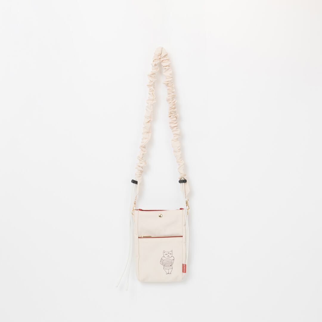 リサイクルナイロン生地にスリーキャッツのネコをプリント。くしゅくしゅショルダーはサイズ調整が可能です。スマートフォンやちょっとした小物を入れてお出かけにお使いください。 SIZE:W115×H190mm(ショルダー最大長さ:1300mm) 素材:表生地:ナイロン、内生地:ポリエステル、金具:亜鉛合金