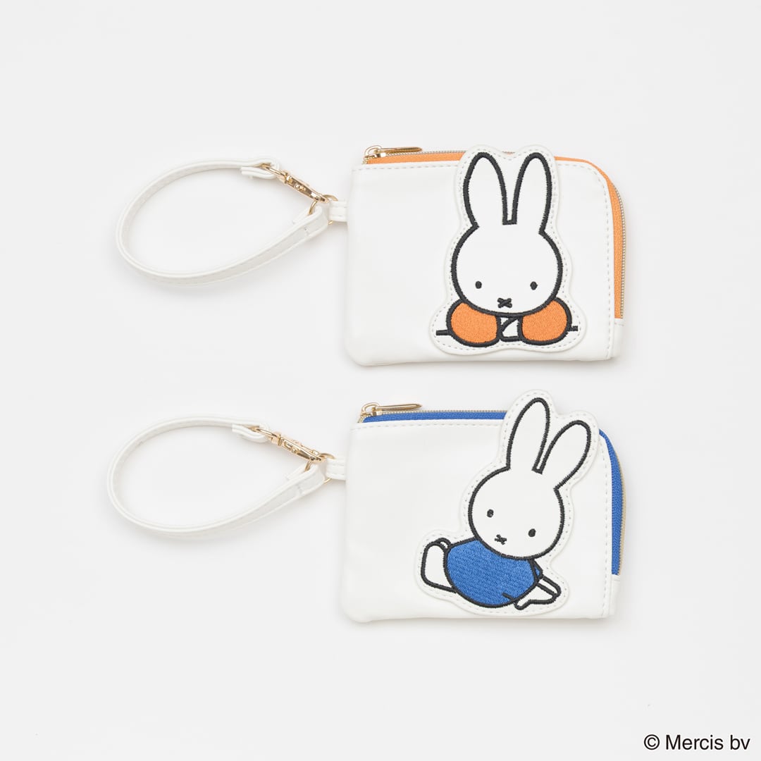LOT:3 ダイカットのミッフィーワッペンにブルーナカラーをアクセントにしたシリーズです。必要なカードやコインが収納でき、ストラップ付きでバッグのハンドルなどにかけてご使用いただけます。全2柄 SIZE:W110×H80mm 素材:表生地:合成皮革 裏生地:ポリエステル
