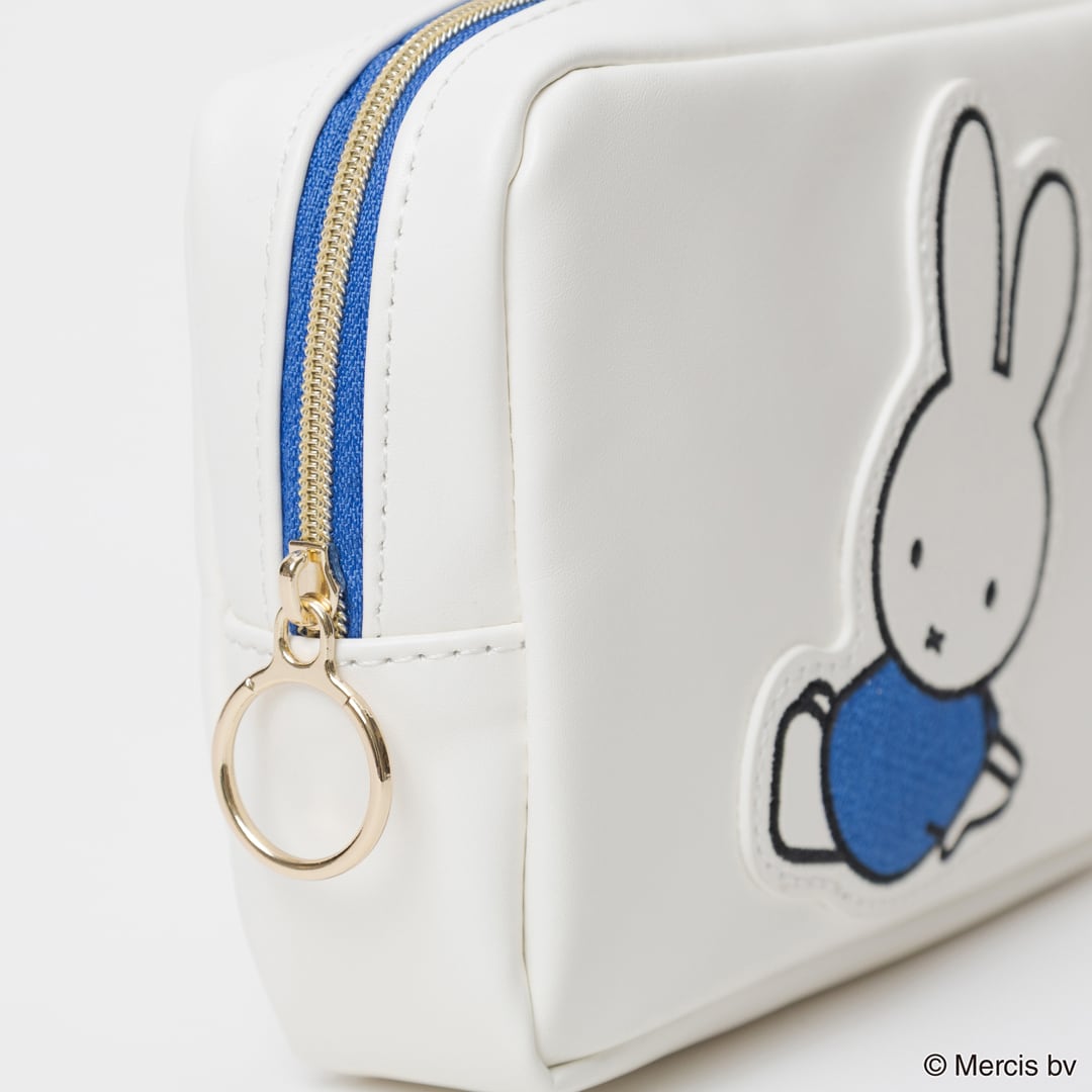 LOT:3 ダイカットのミッフィーのワッペンにブルーナカラーをアクセントにしたシリーズです。コスメの収納に便利なマチ付きポーチです。全2柄 SIZE:W140×H105×D40mm 素材:表生地:合成皮革 裏生地:ポリエステル