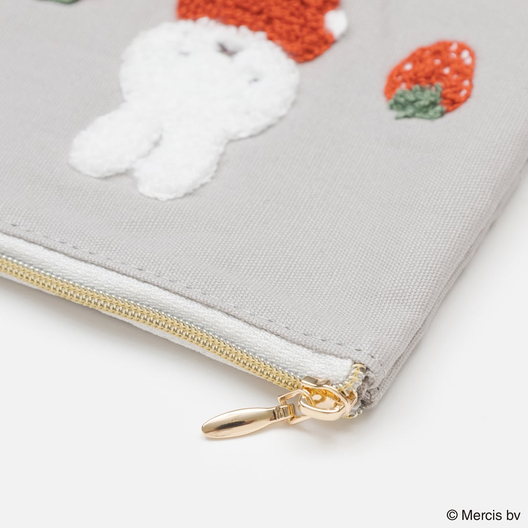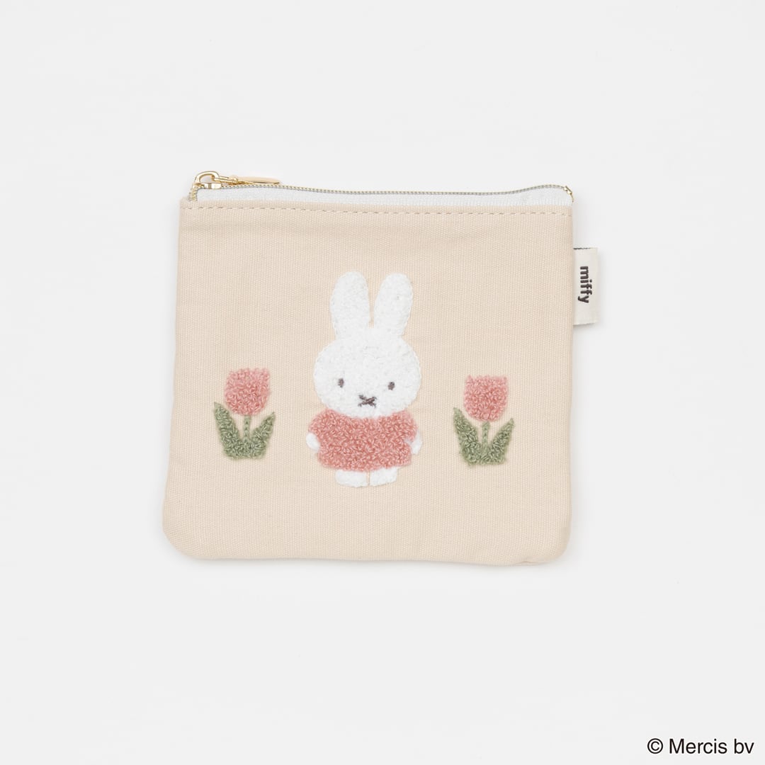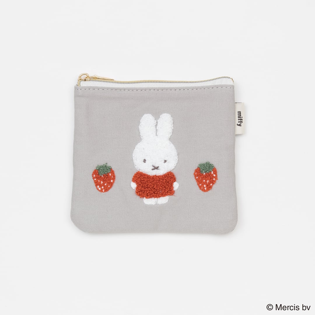 ミッフィーとイチゴやチューリップ柄が相良刺繍で施されたティッシュポーチです。リップや目薬などの小物が入り、背面にはティッシュが入ります。全2柄 SIZE:W130×H110mm 素材:本体:綿