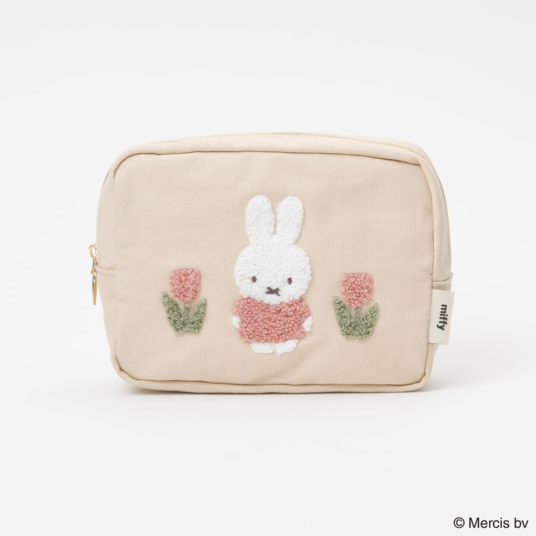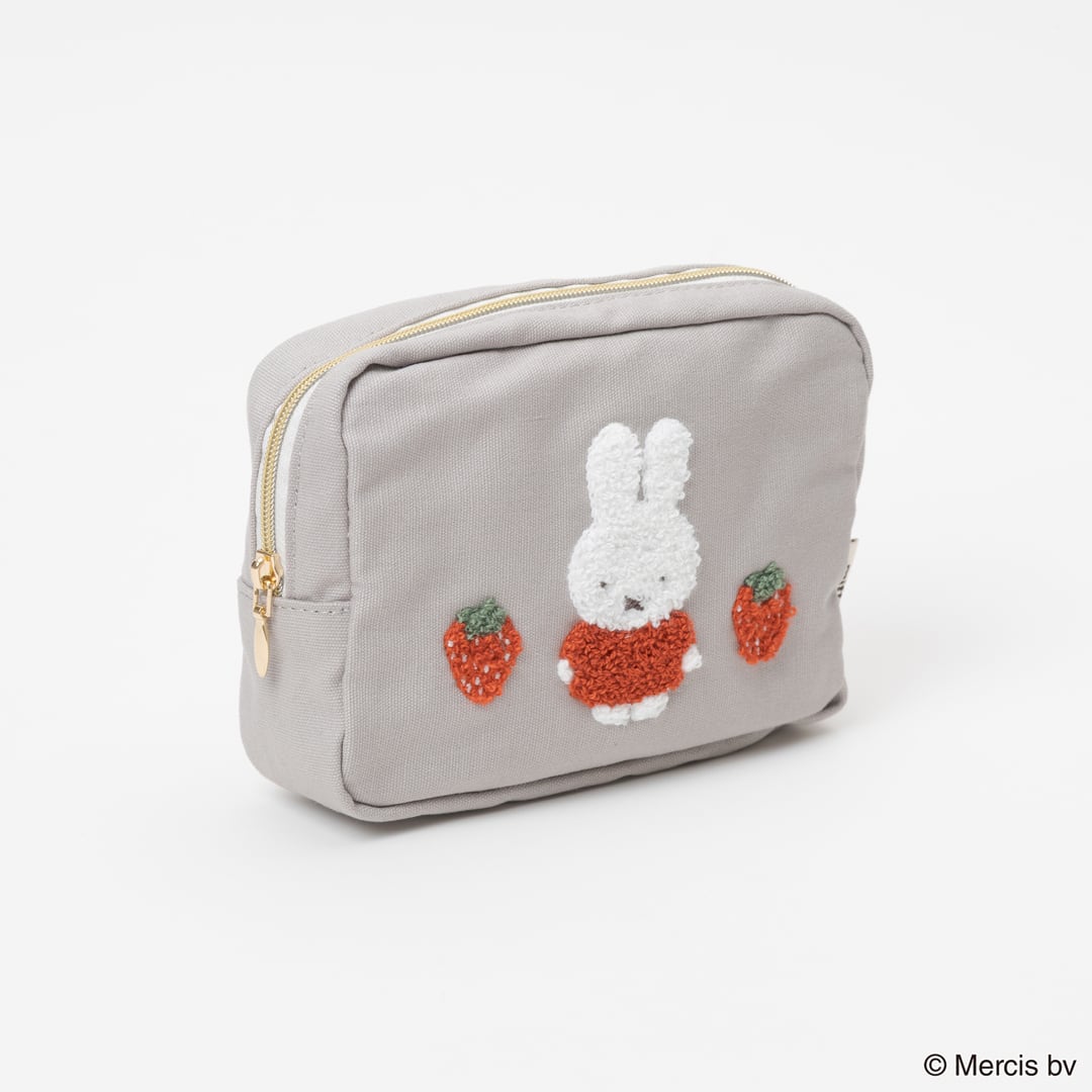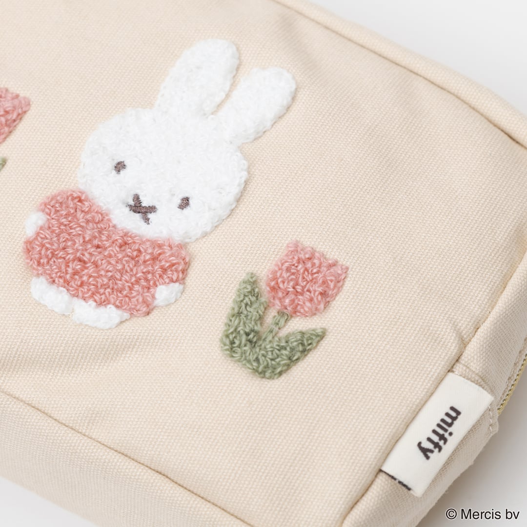 ミッフィーとイチゴやチューリップ柄を相良刺繍で施したスクエアポーチです。マチがありモバイルのコードやコスメ類などの収納に便利な形状です。全2柄 SIZE:W140×H105×D40mm 素材:本体:綿