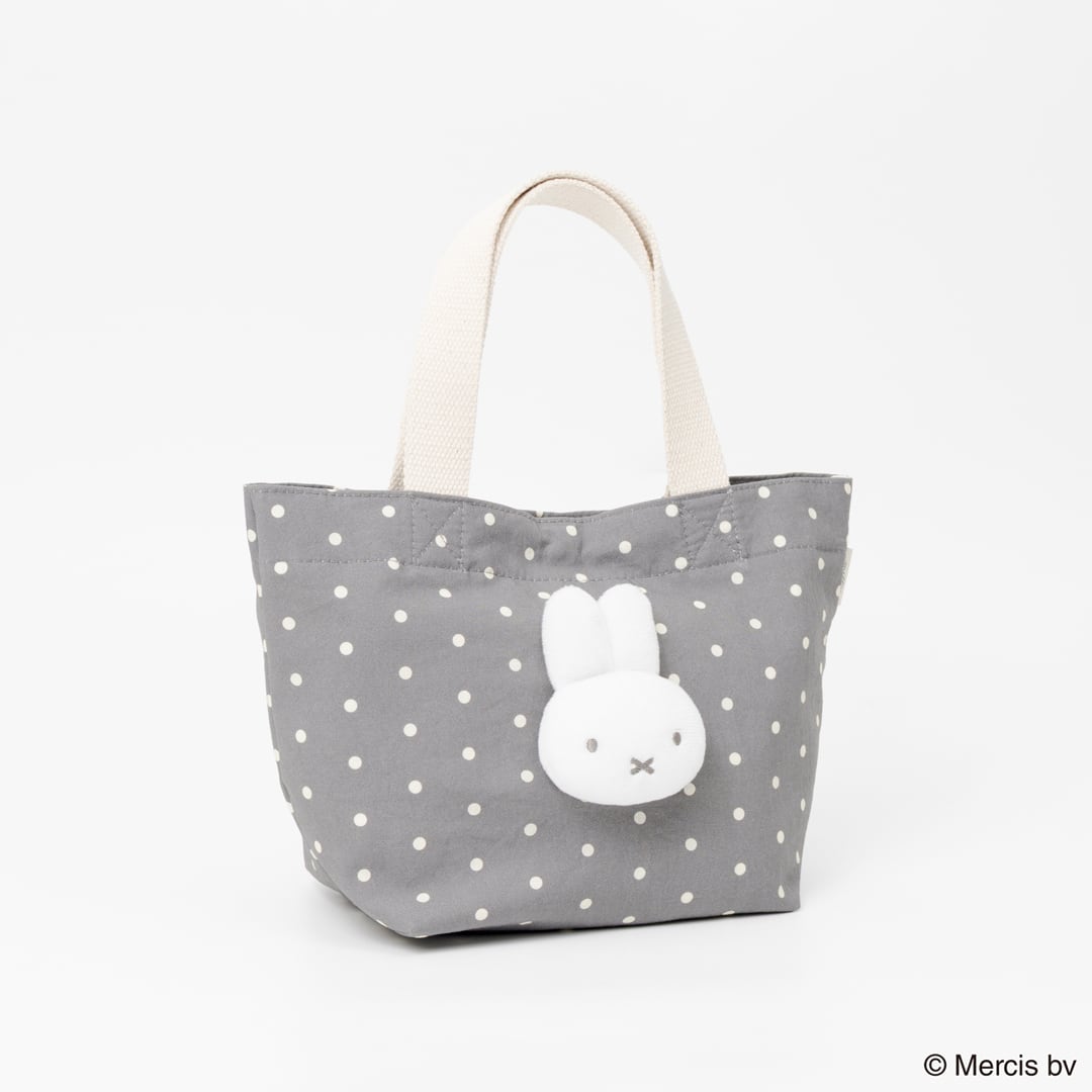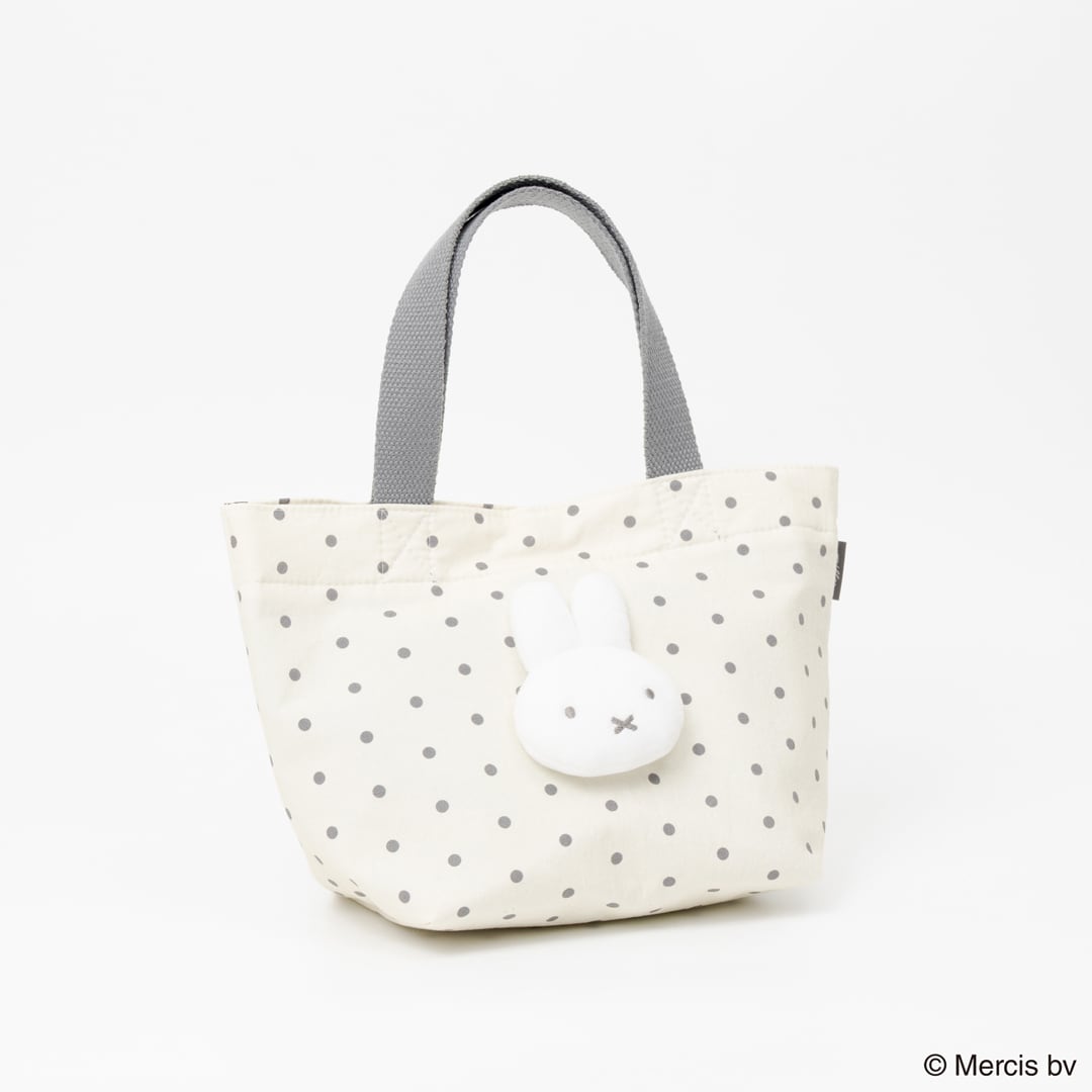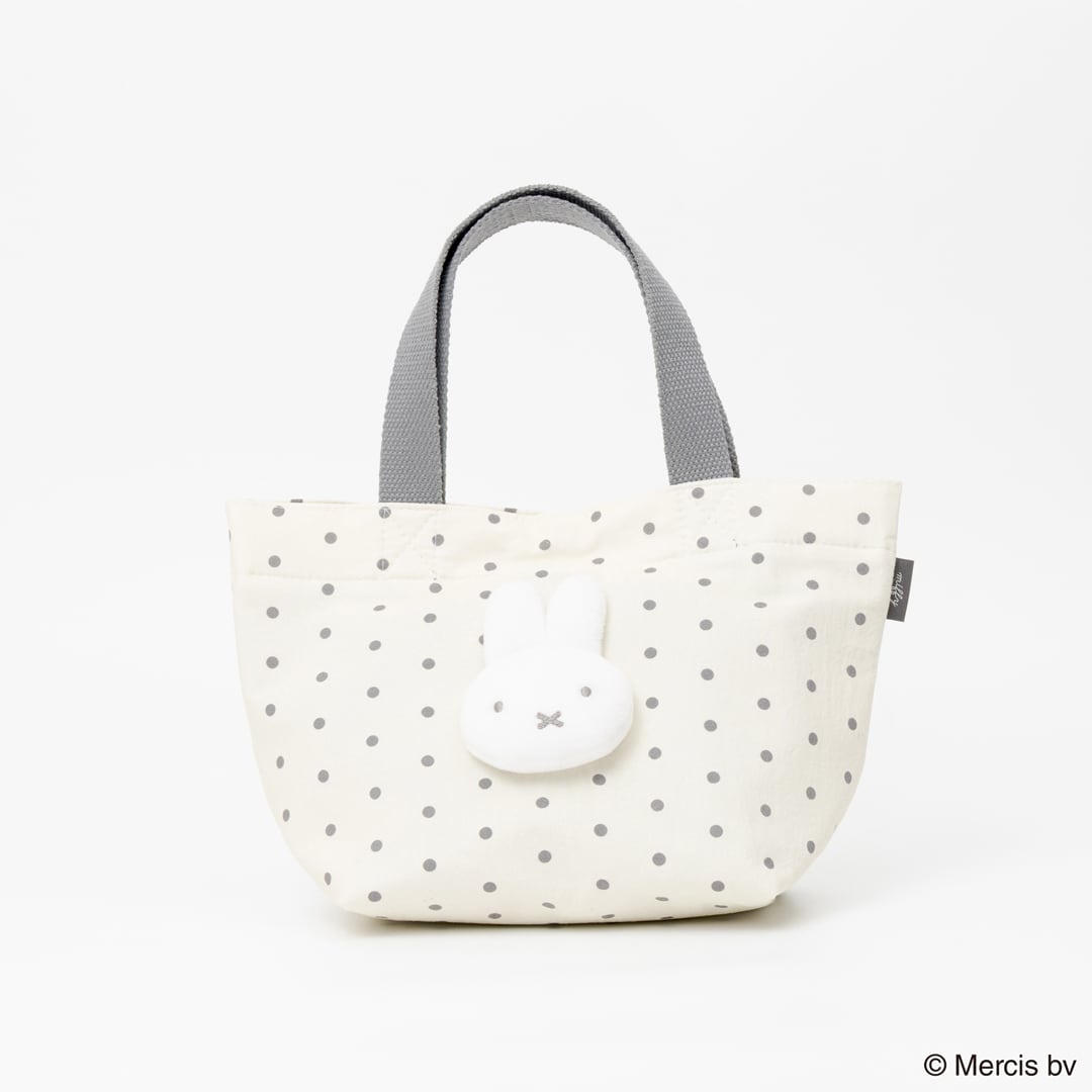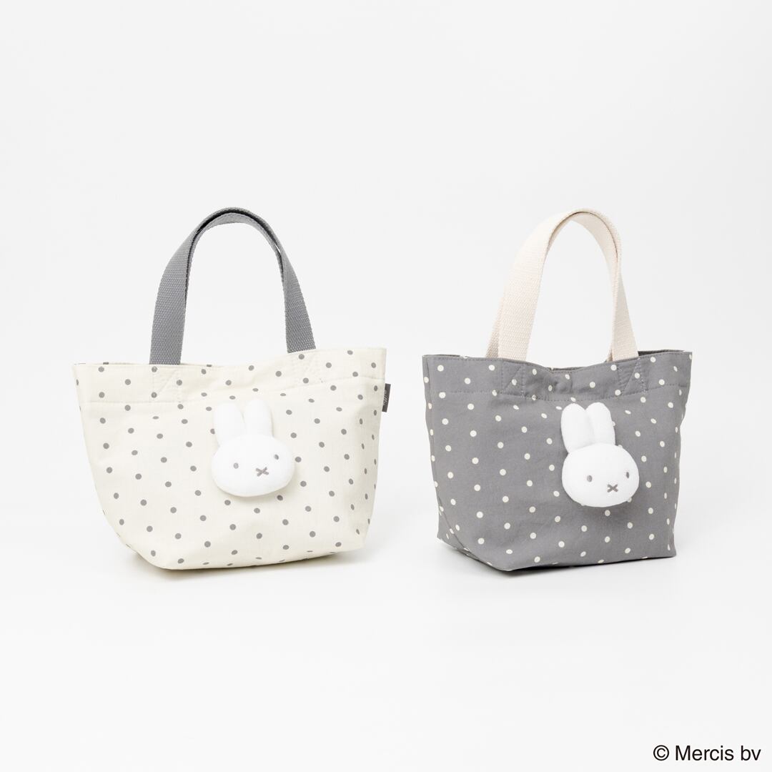 モノトーンのドット柄にミッフィーのマスコットが付いたシリーズ。財布やスマホ等のちょっとしたお出掛けに便利な小さめのトートバッグです。全2色 SIZE:W280(165)×H180×D120mm 素材:表地:綿、裏地:ポリエステル