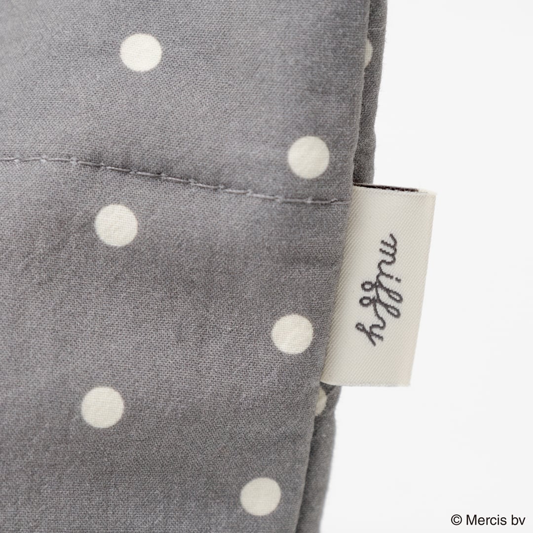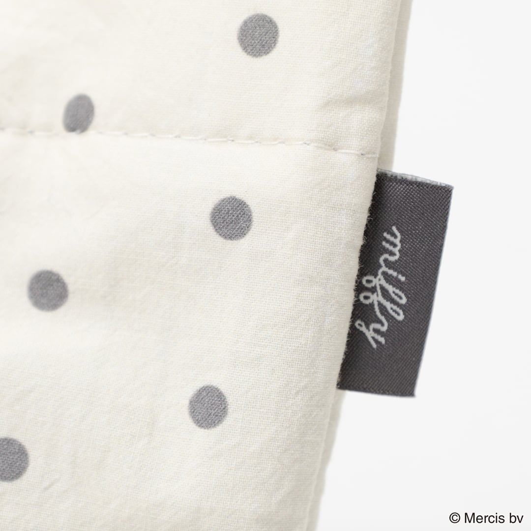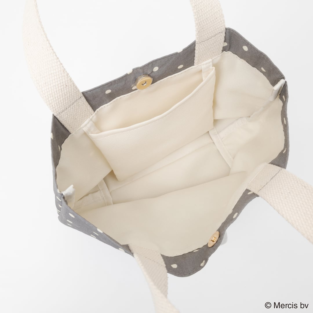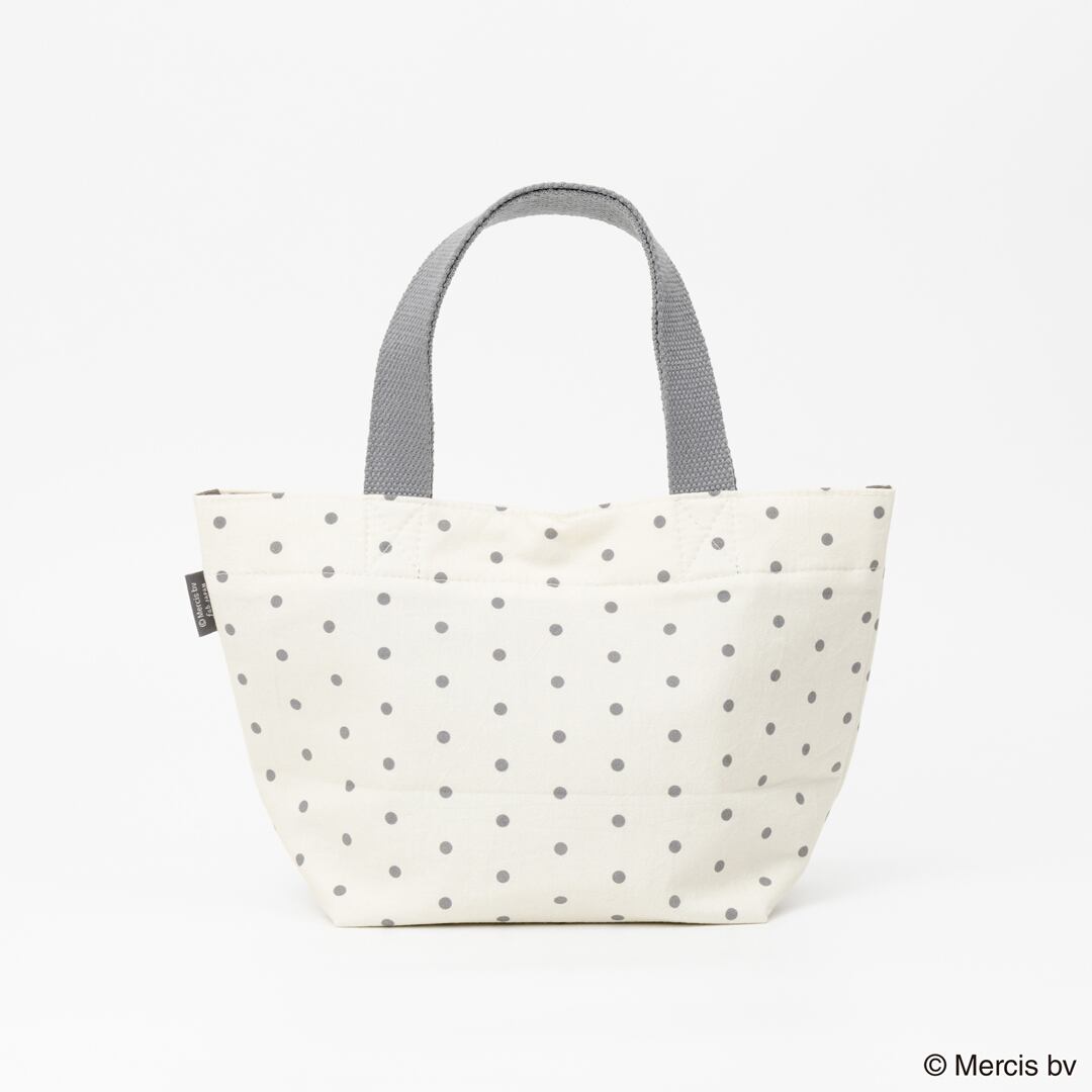 モノトーンのドット柄にミッフィーのマスコットが付いたシリーズ。財布やスマホ等のちょっとしたお出掛けに便利な小さめのトートバッグです。全2色 SIZE:W280(165)×H180×D120mm 素材:表地:綿、裏地:ポリエステル