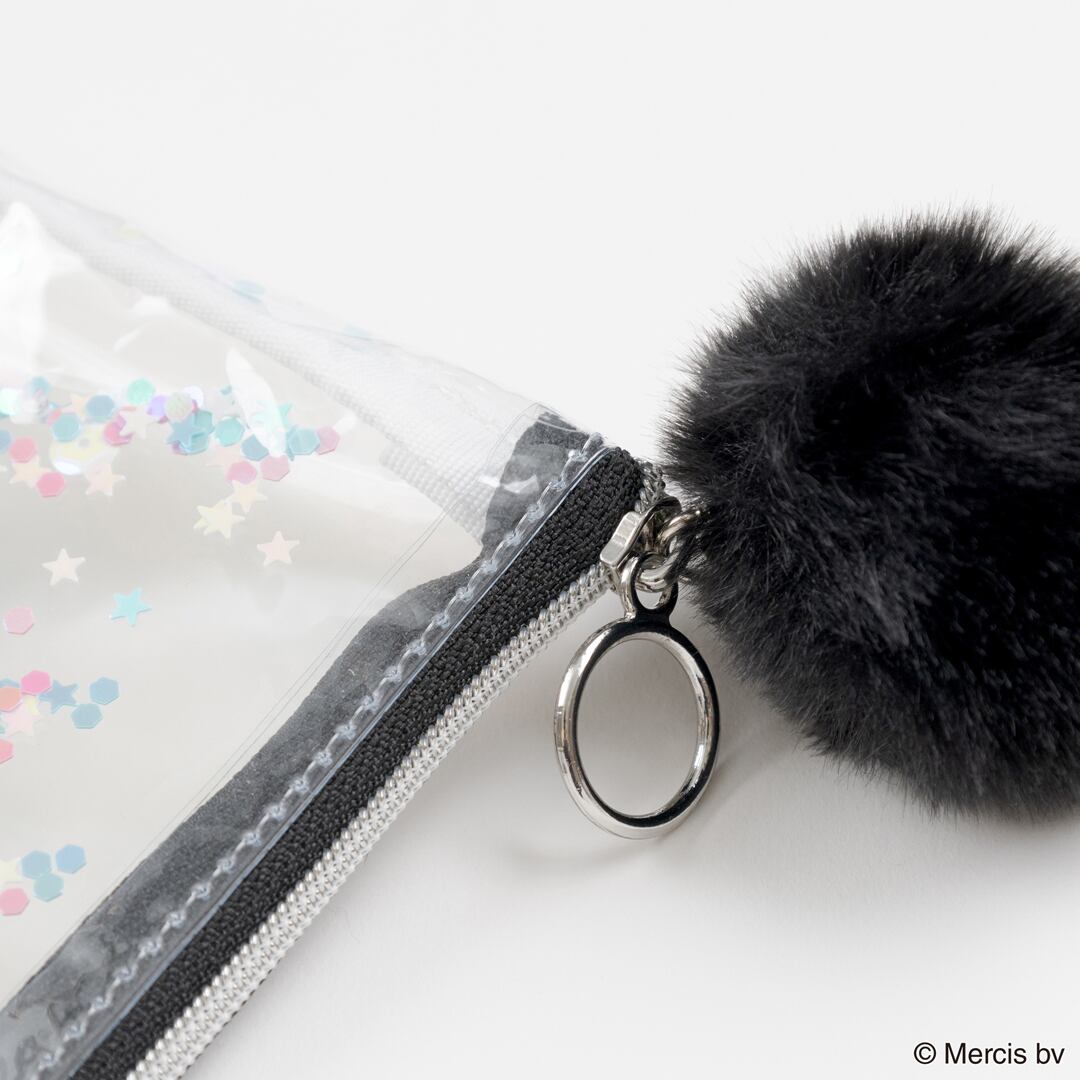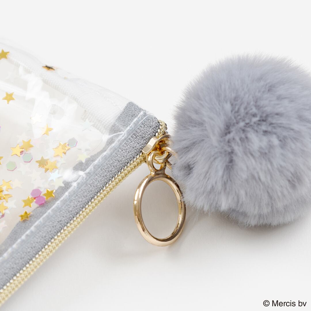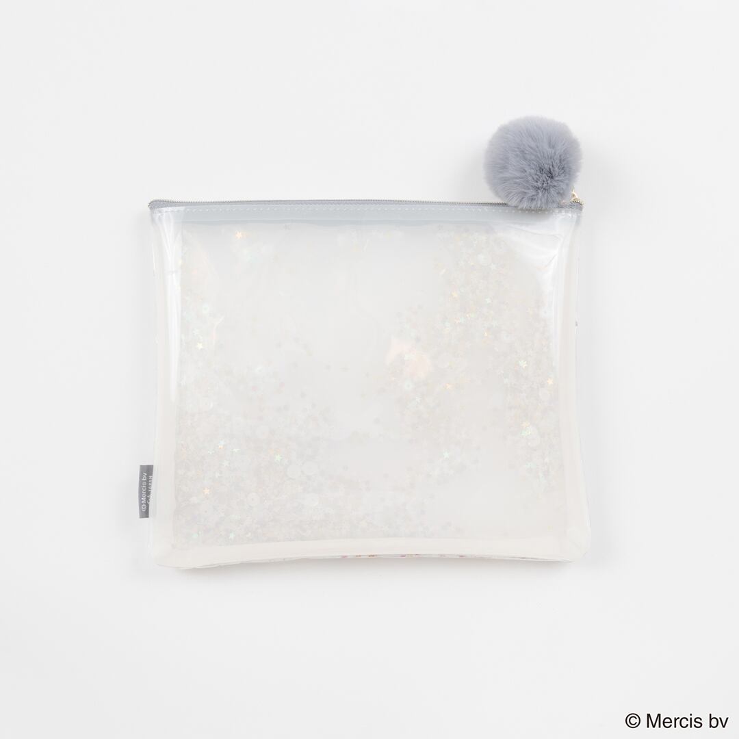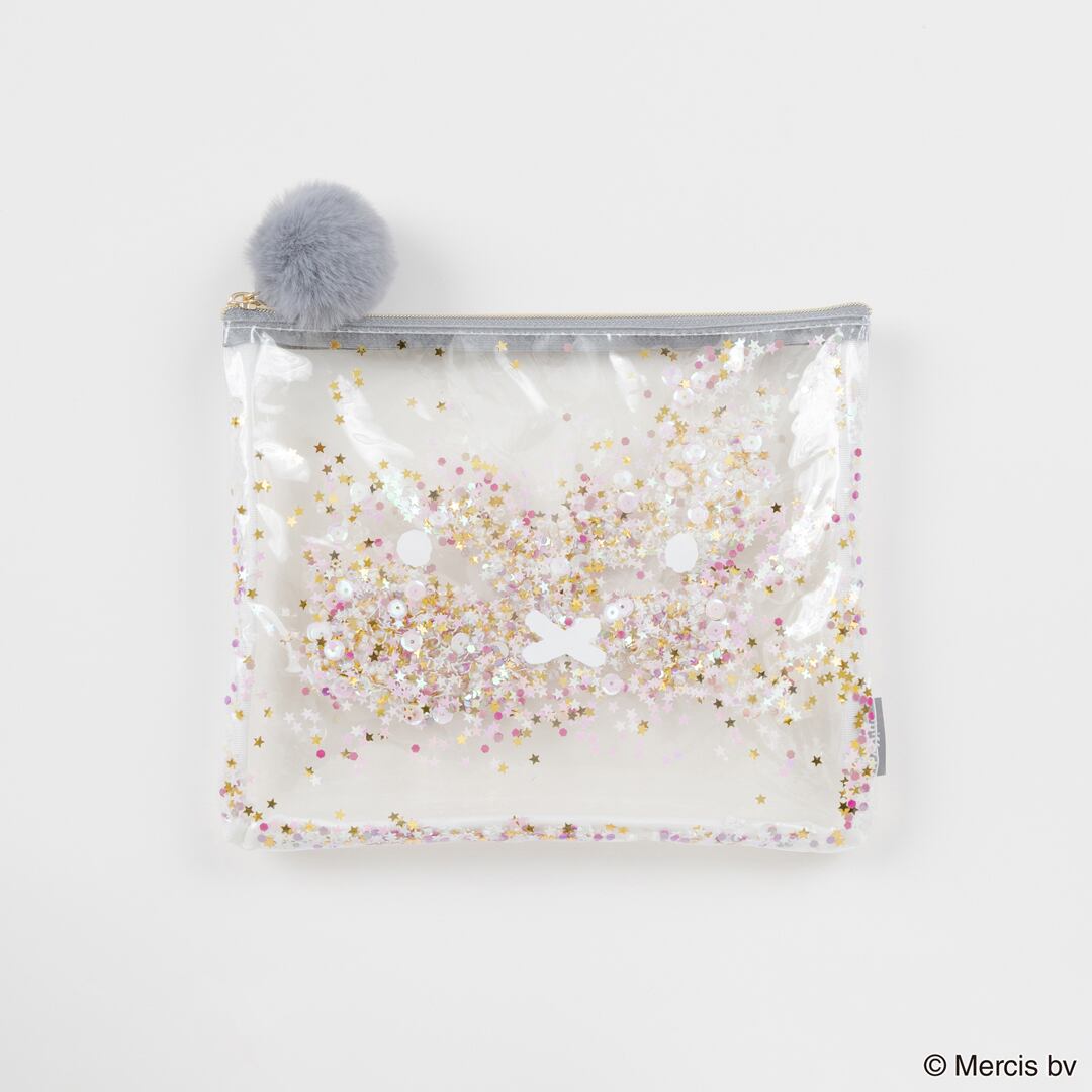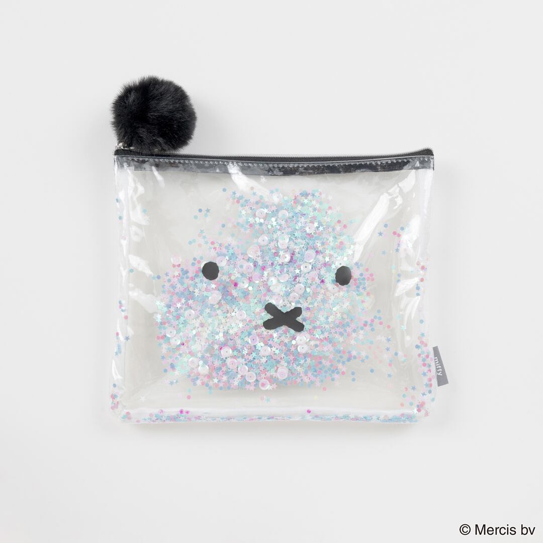 Miffyの顔がプリントされた透明な塩化ビニル生地の間に、優しく輝くスパンコールやビーズがシャラシャラと動く、大人かわいいフラットポーチです。SIZE:W210×H170mm 素材:本体:塩化ビニル