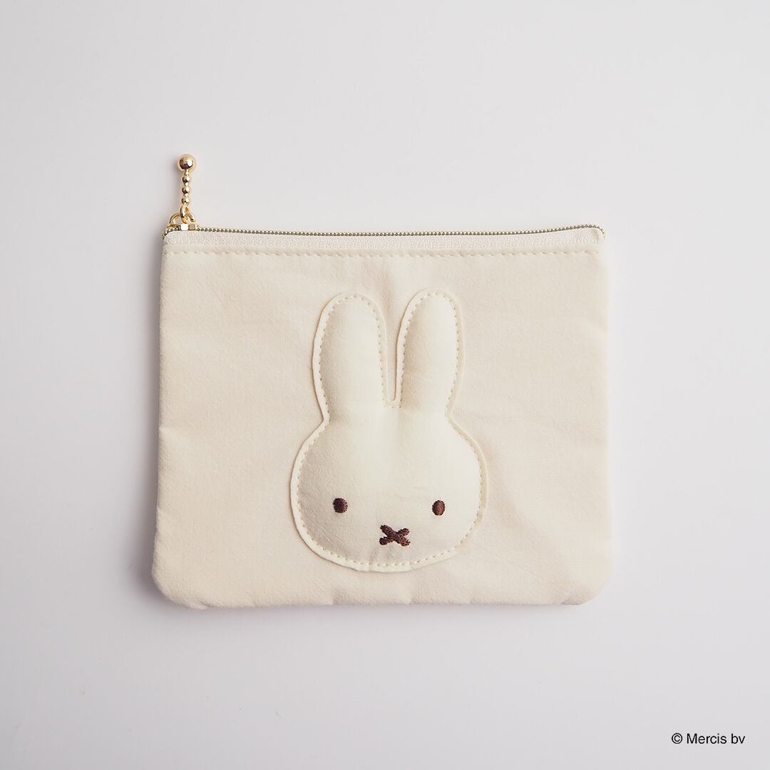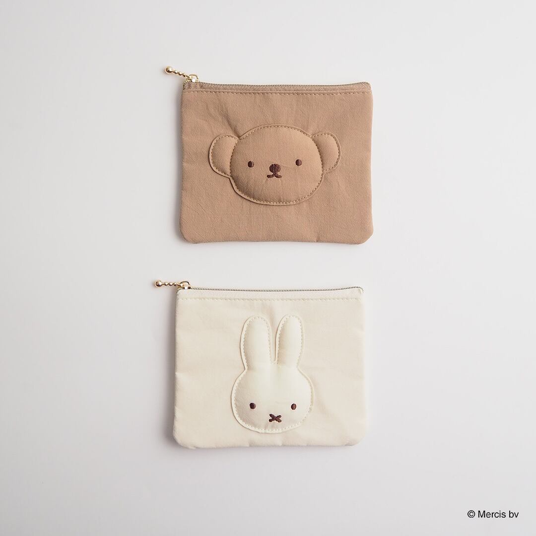 ミッフィーとボリスのふっくらとしたワッペンがついた、コットン素材のベーシックなシリーズ。目薬やコスメなどの小物が入る普段使いしやすいポーチです。全2柄 SIZE:W140×H110mm 素材:表地:綿、裏地:ポリエステル