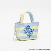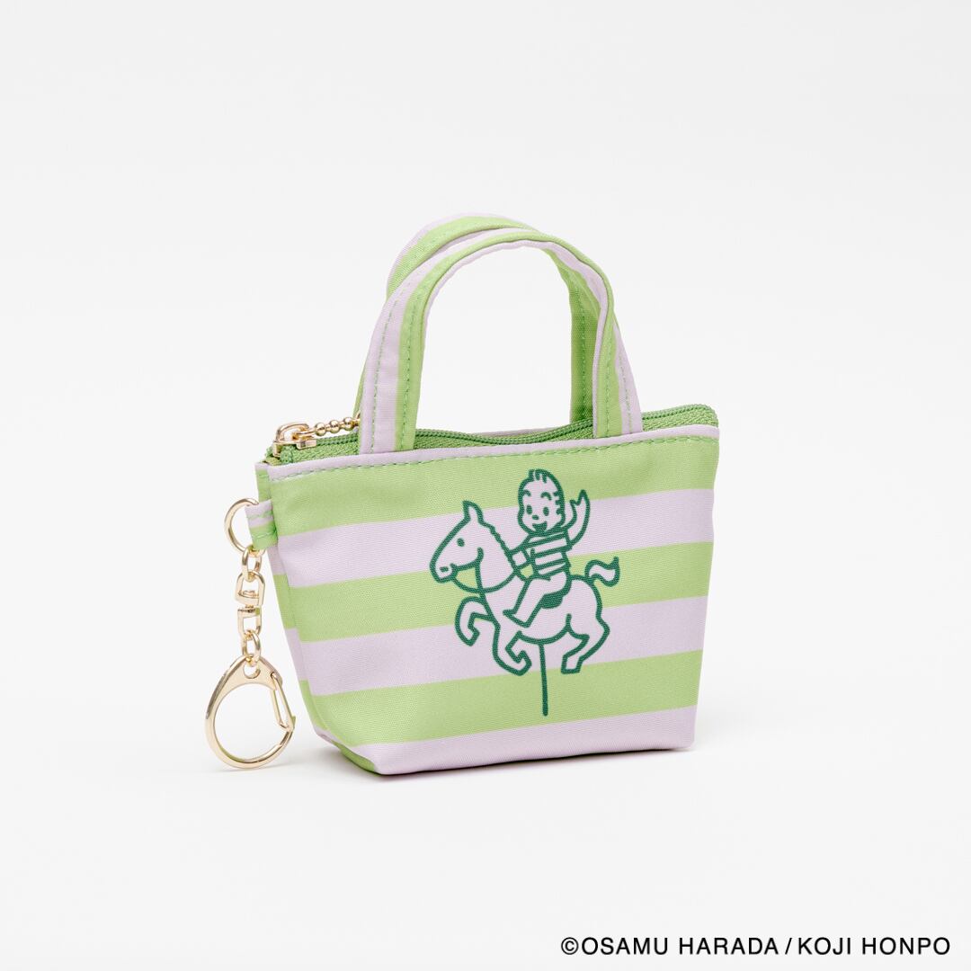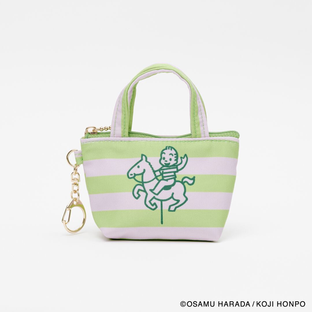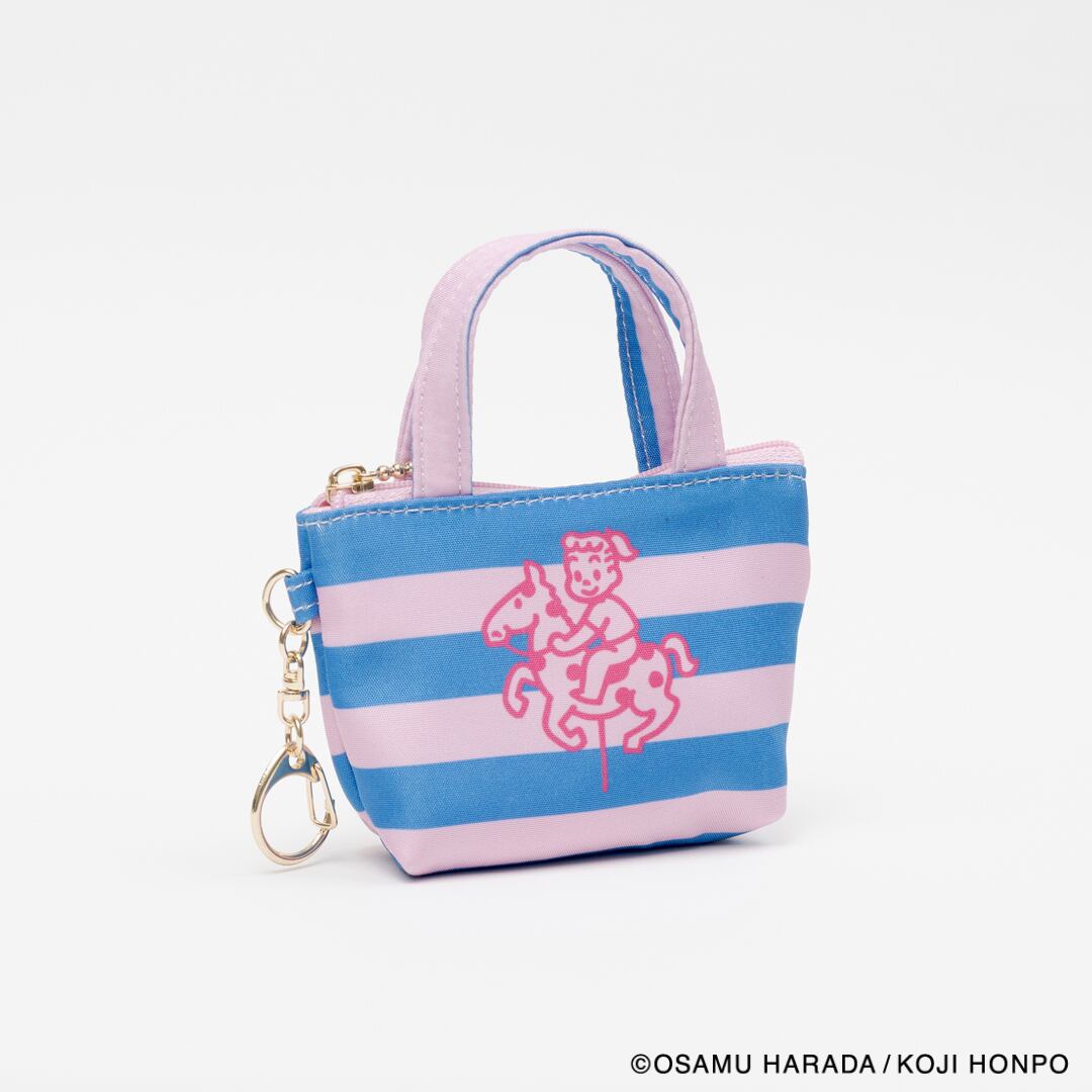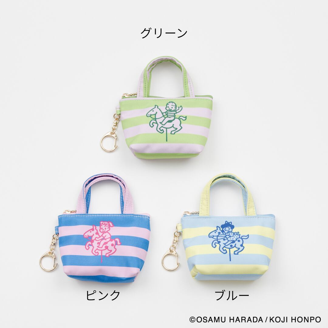 メリーゴーランドに乗っているイラストと、ストライプの組み合わせが目を引くデザインのミニサイズのトートバッグ型チャームです。小銭やいイヤフォンの収納に便利です。SIZE:W120(80)×H70×D40mm 素材:本体:ポリエステル