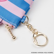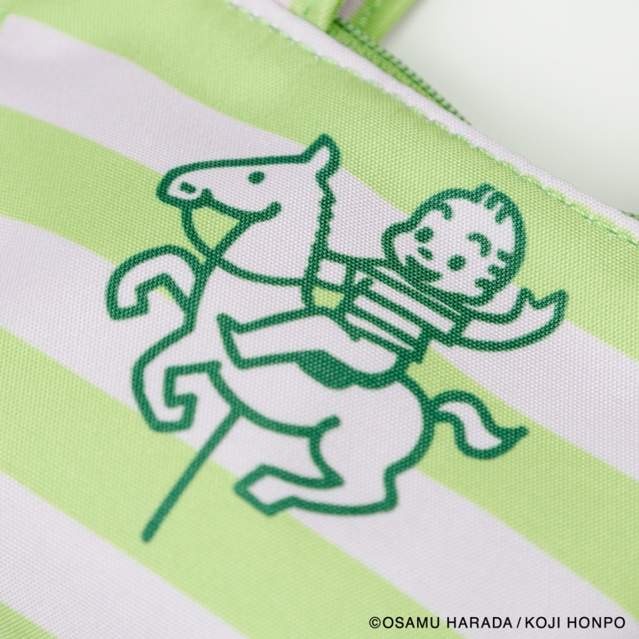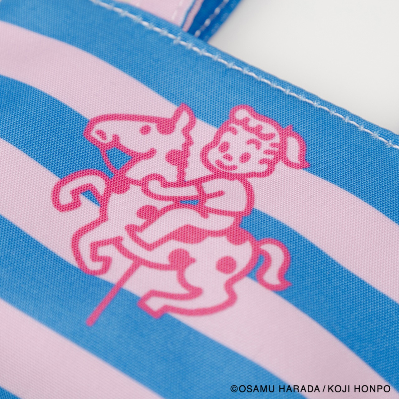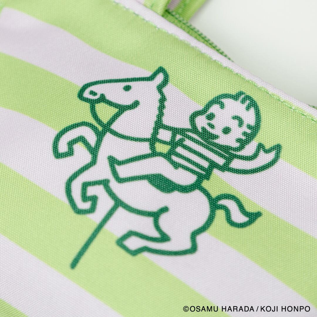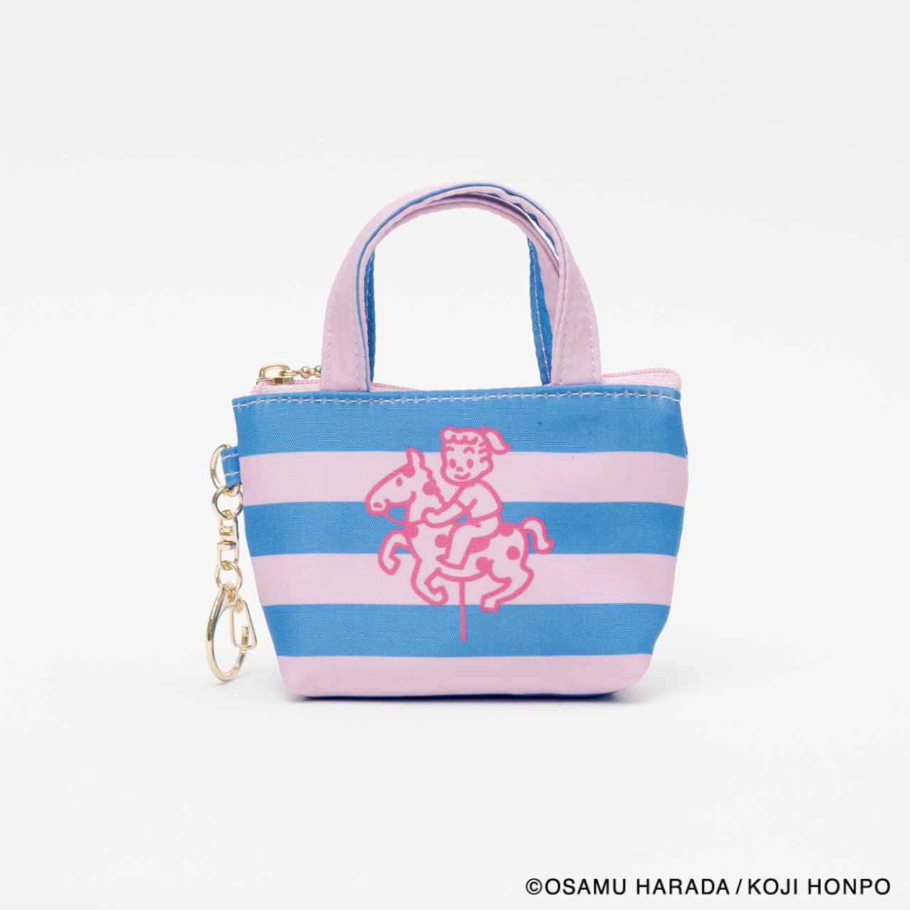 メリーゴーランドに乗っているイラストと、ストライプの組み合わせが目を引くデザインのミニサイズのトートバッグ型チャームです。小銭やいイヤフォンの収納に便利です。SIZE:W120(80)×H70×D40mm 素材:本体:ポリエステル