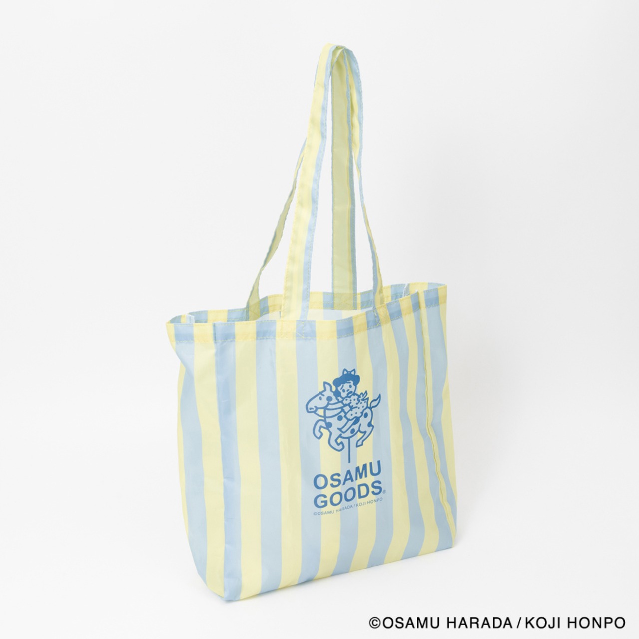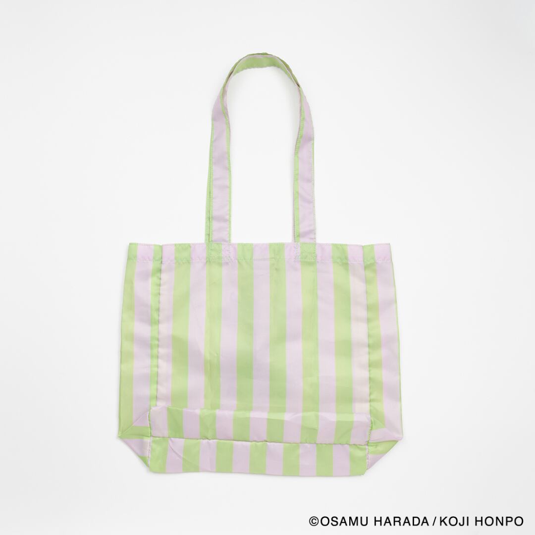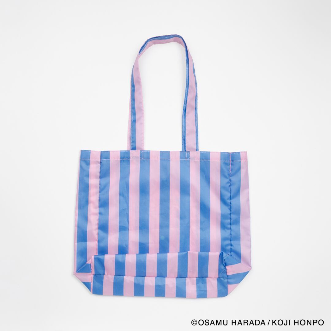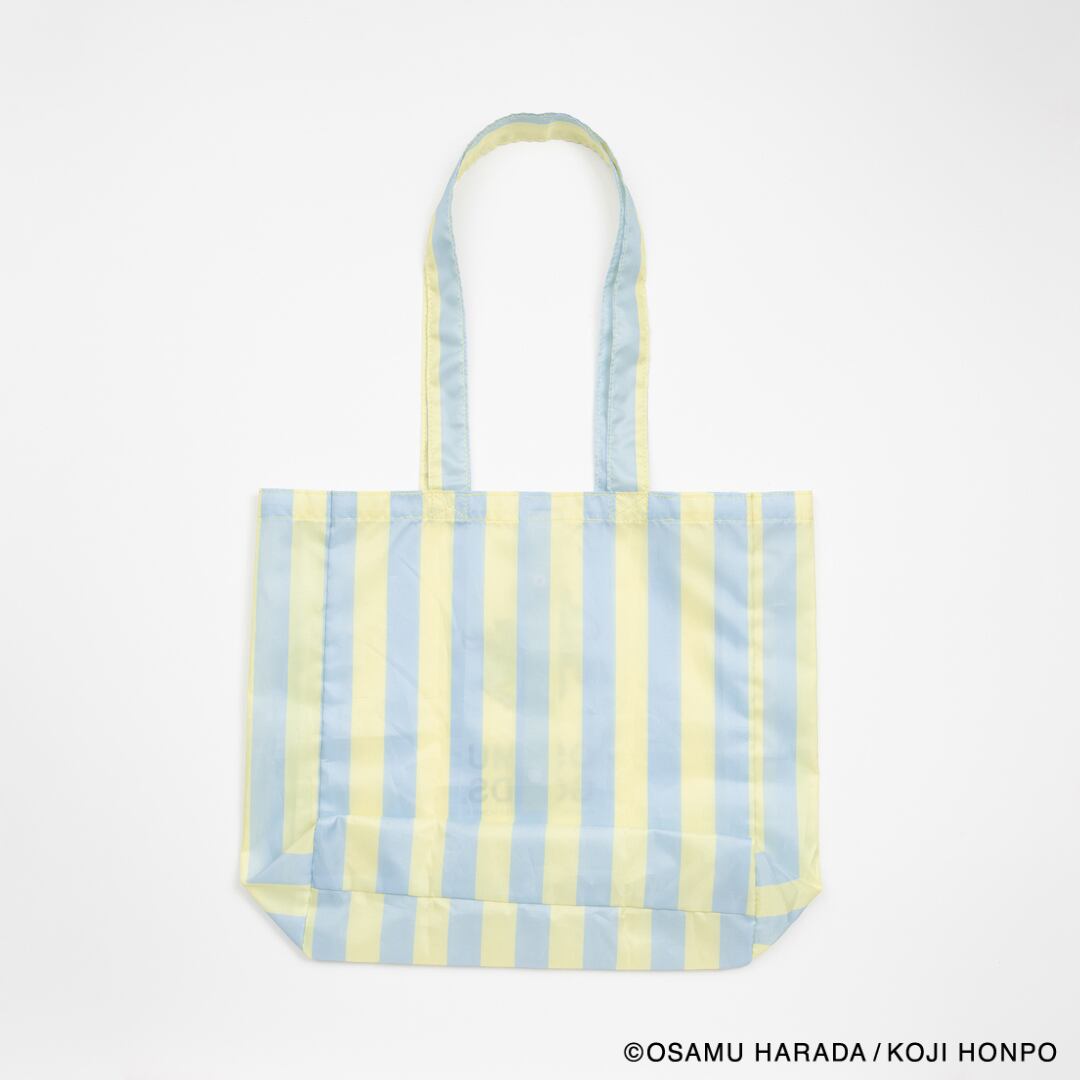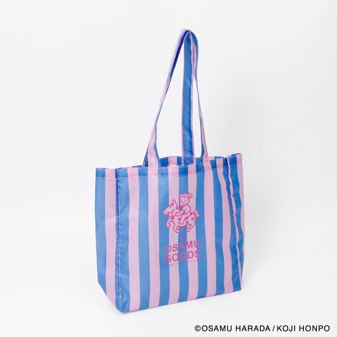 メリーゴーランドに乗っているイラストと、ストライプの組み合わせが目を引くデザインのトートバッグです。A4サイズがすっぽり入る使いやすいサイズです。SIZE:W300×H320mm 素材:本体:ポリエステル